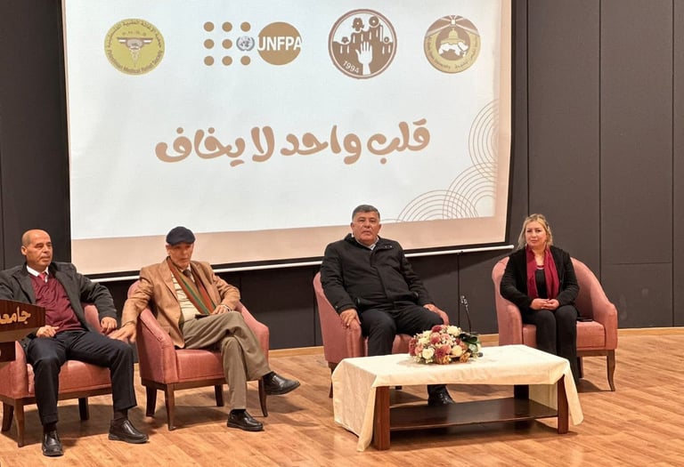 بالتزامن مع حملة الـ16 يومًا لمناهضة العنف ضد المرأة، عُقد اليوم لقاء حواري بعنوان «قلب واحد لا يخاف»، وذلك في إطار اختتام مشروع نفّذته جمعية الدفاع عن الأسرة بالشراكة مع جمعية الإغاثة الطبية الفلسطينية، وبدعم وتمويل من صندوق الأمم المتحدة للسكان (UNFPA).